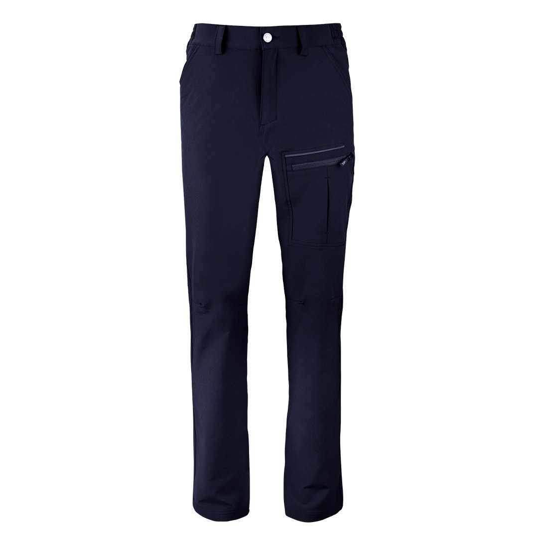 Višenamenske pantalone od 4-way stretch materijala, 190 g/m², sa produženim pojasom na zadnjoj strani. Dva prednja džepa, dva džepa sa rajsferšlusom, trostruki štepovi kao ojačanje