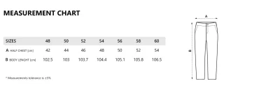 Tkanina: ripstop, 155 g/m2 Veličine: 48 (S), 50 (M), 52 (L), 54 (XL), 56 (XXL), 58(3XL), 60 (4XL) Sastav: 90% poliamid, 10% elastin Pakovanje: 16/1 (48, 50, 52, 54); 14/1 (56, 58, 60) Preporučena štampa: vez, sito