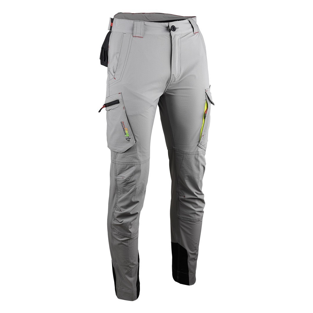Elastične radne pantalone od Ripstop tkanine, 155 g/m², sastava 90% poliamid, 10% elastin. Ojačanja su napravljena od vodootpornog oksforda, 175 g/m², sastava 100% poliester. Pantalone imaju fleksibilno plastično dugme (Ø 20mm), Vislon patentni šlic, produženi pojas sa zadnje strane, antiklizni struk sa elastičnom trakom pozadi, dva prednja džepa, dva džepa na butinama, zadnji džep sa preklopom, držač za alat, i ojačanje u preponama.