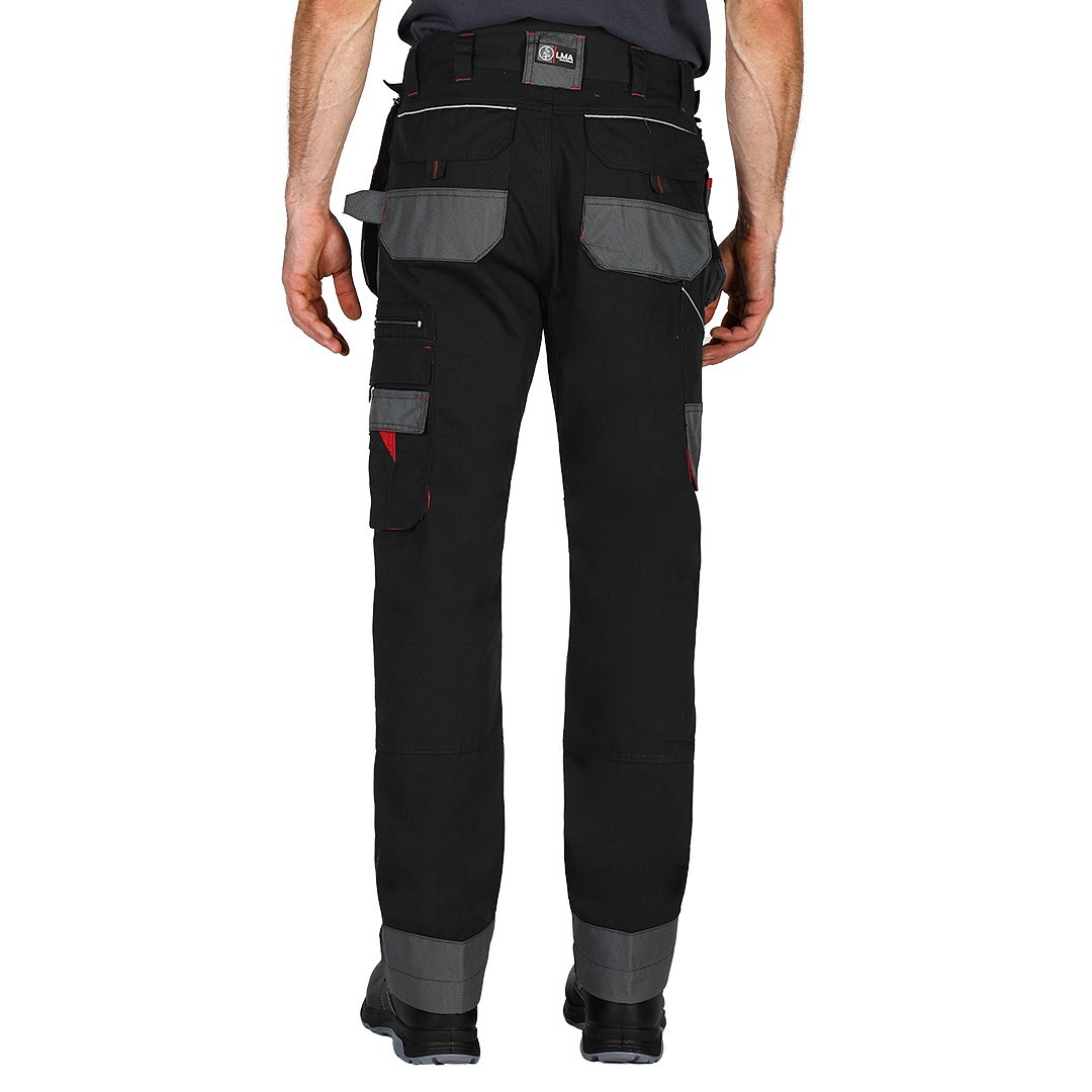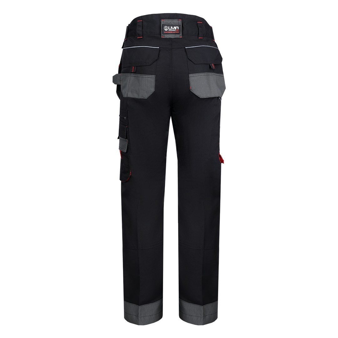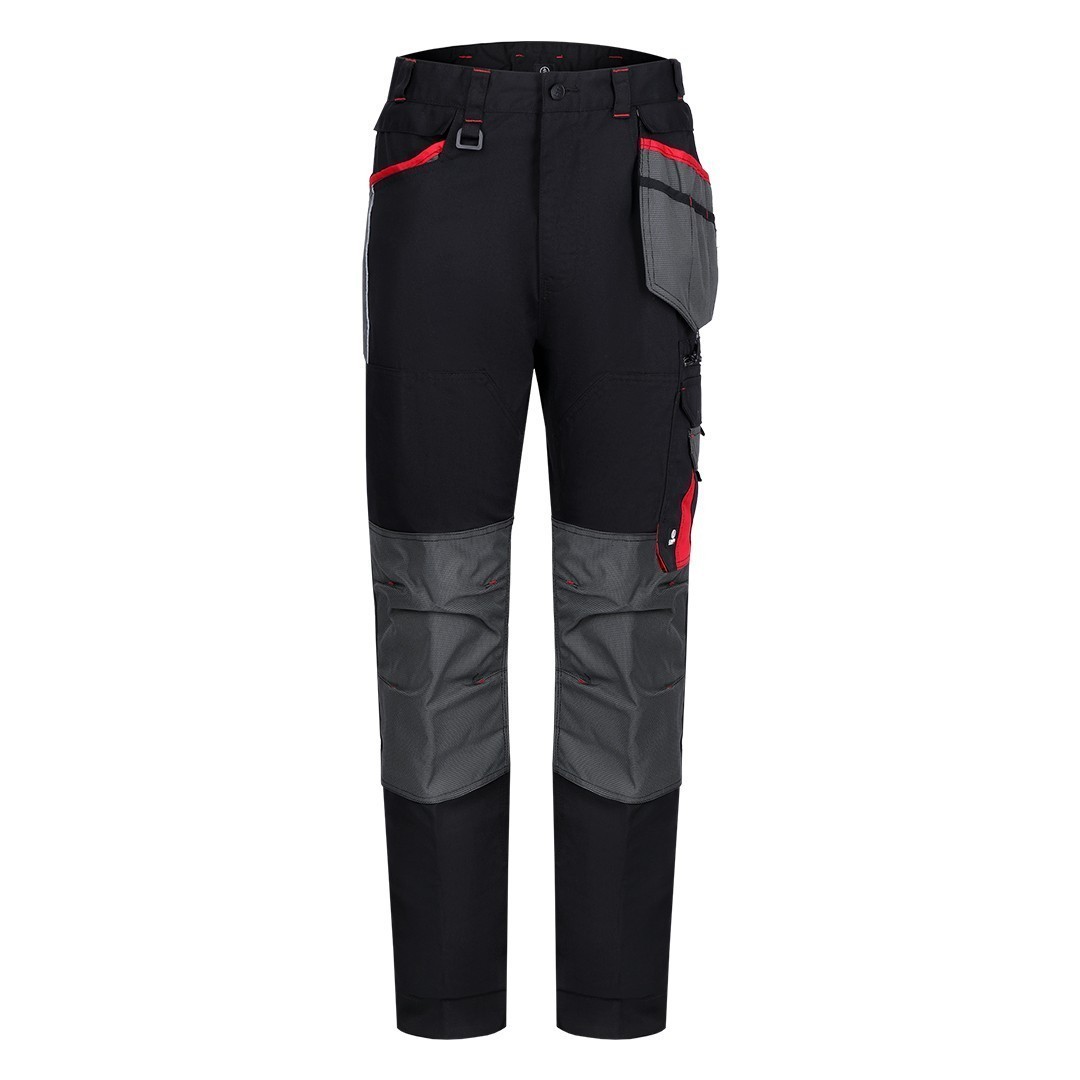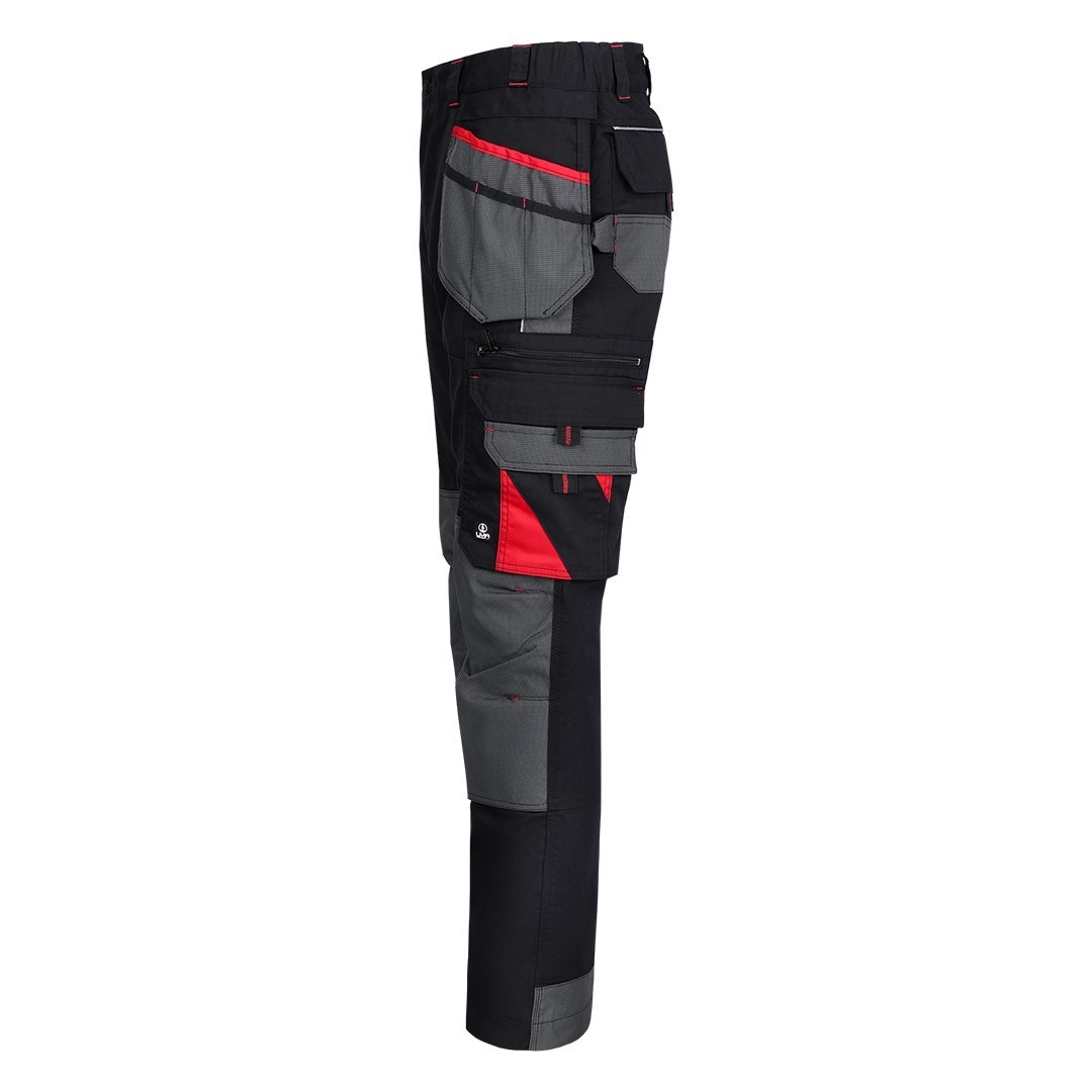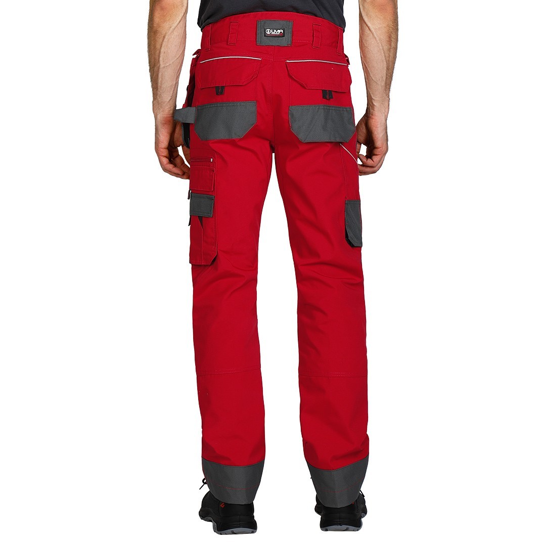 Radne pantalone, 260g/m2 platno prepletaj, ojačanja od 600D poliestera na mestima izloženim većem habanju (džepovi, kolena), džepovi za umetanje štitnika za kolena, dva prednja džepa, dva skidajuća prednja džepa, dva pozadi i jedan džep sa strane sa dodatnim džepovima, reflektivni detalji, gajka za čekić, praktični odeljci za alat, plastična alka za ključeve, pojas sa lastišem za dodatnu udobnost, trostruki štepovi kao ojačanje