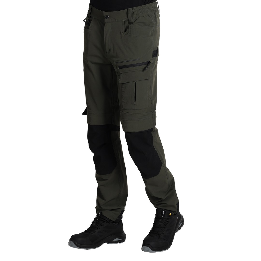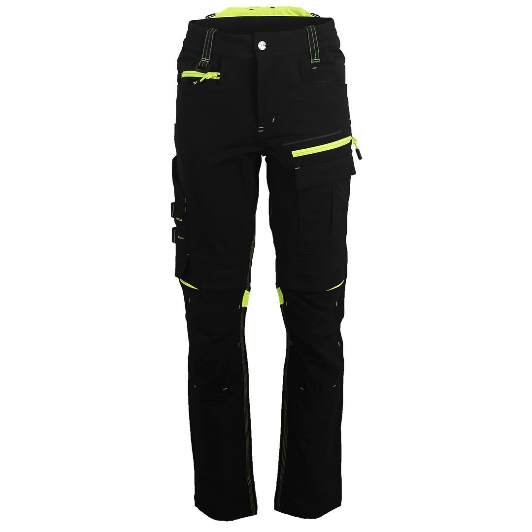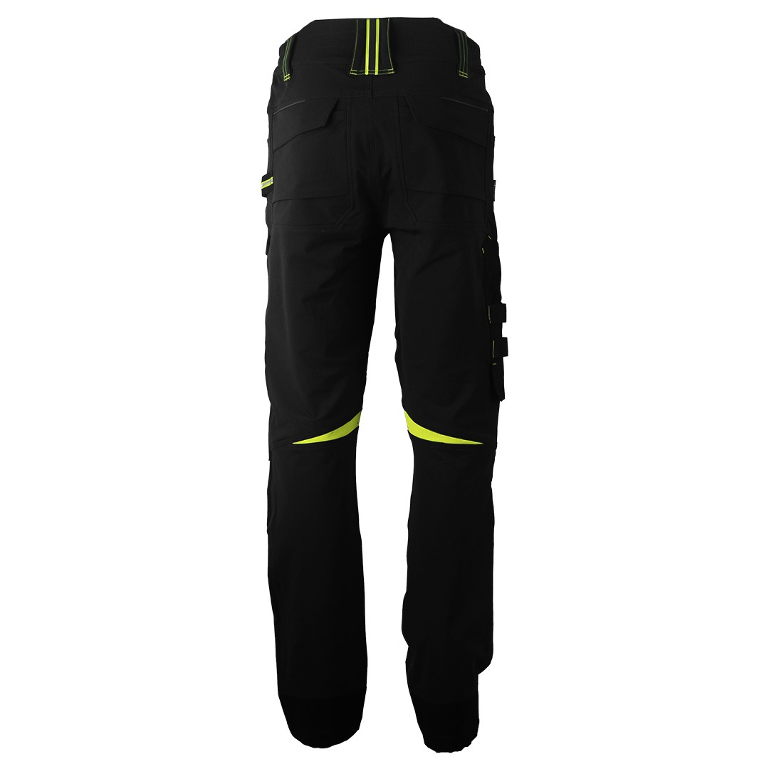 Elastične radne pantalone od 4-way stretch najlona, 260 g/m², sa produženim pojasom na zadnjoj strani, ojačanjima na kolenima i zadnjem delu nogavica. Dva prednja džepa, dva zadnja džepa sa preklopom, dva multifunkcionalna džepa na nogavicama, trostruki štepovi kao ojačanje, reflektivni detalji.