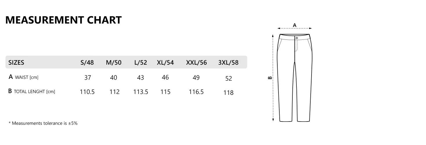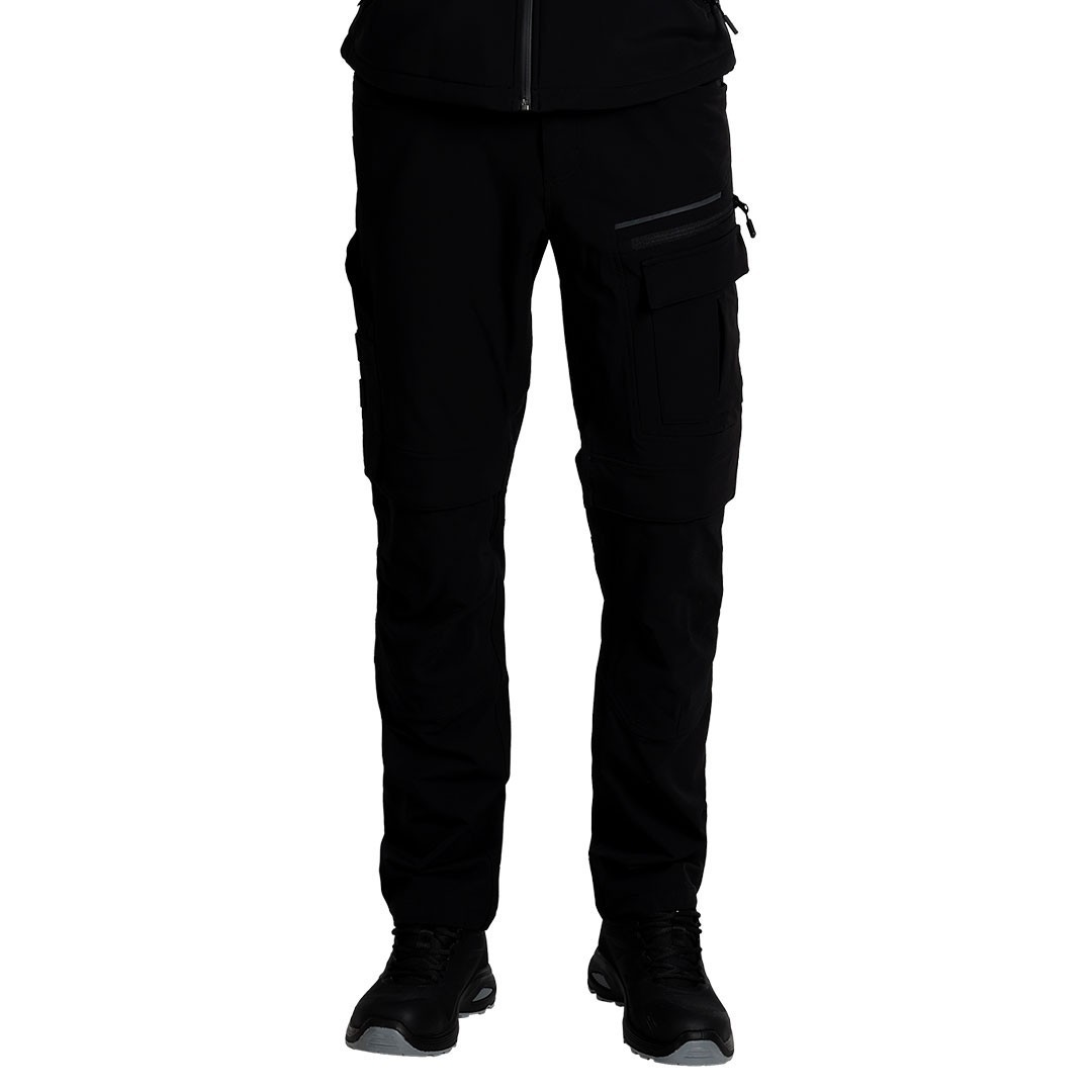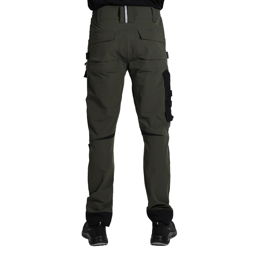 Elastične radne pantalone od 4-way stretch najlona, 260 g/m², sa produženim pojasom na zadnjoj strani, ojačanjima na kolenima i zadnjem delu nogavica. Dva prednja džepa, dva zadnja džepa sa preklopom, dva multifunkcionalna džepa na nogavicama, trostruki štepovi kao ojačanje, reflektivni detalji.