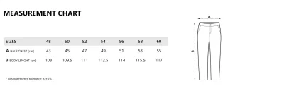 Veličine: S (48), M (50), L (52), XL (54), XXL (56), 3XL (58), 4XL (60) Tkanina: dobi, 295 g/m2 Sastav: 93% poliamid, 7% elastin Pakovanje: 20/1 Preporučena štampa: vez, sito, preslikač