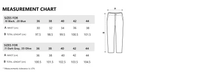 Osnovni materijal je mešavina poliestera i pamuka, dok su elastični delovi od poliamida sa elastinom postavljeni u zadnjem delu i u predelu kolena radi lakšeg kretanja i većeg komfora. Pojas sa integrisanom elastičnom trakom omogućava bolje prilagođavanje struku. Praktičan raspored džepova i YKK rajsferšlusi doprinose pouzdanosti i dugotrajnoj upotrebi.