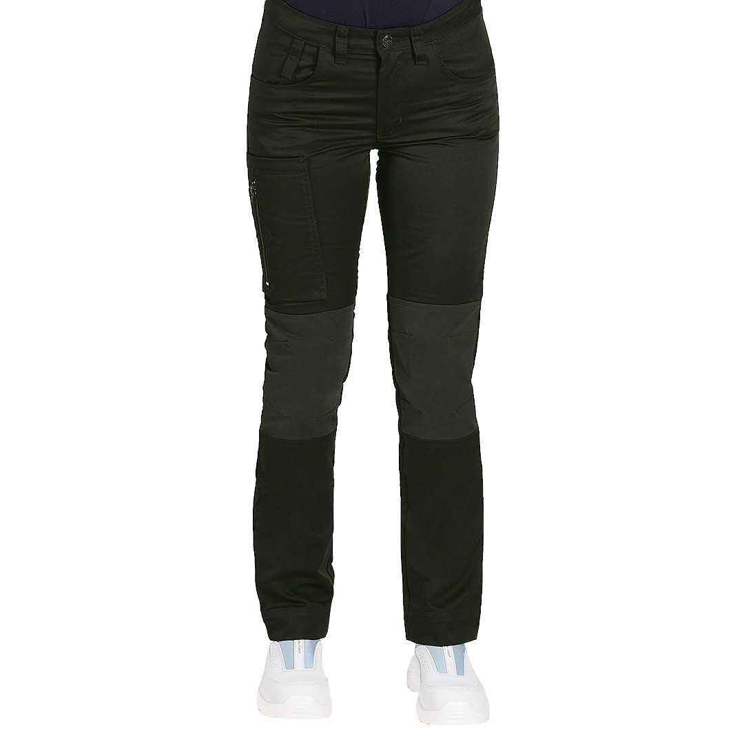 Ženske servisne radne pantalone • 65% poliester / 35% pamuk (osnovni materijal) • 91% poliamid / 9% elastin (elastični paneli) • 210 g/m² • Kroj prilagođen ženskoj građi • Elastični paneli u zadnjem delu i na kolenima • Integrisana elastična traka u pojasu • Višestruki funkcionalni džepovi • YKK rajsferšlusi • Trostruko ojačani šavovi • Pogodne za servis, logistiku i svakodnevni rad • Dostupna muška verzija
