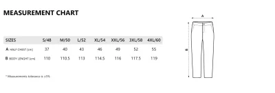 Standard: EN20471 Veličine: S (48), M (50), L (52), XL (54), XXL (56), 3XL (58), 4XL (60) Tkanina: keper, 280 g/m2 Sastav: 56% poliester, 34% elastin, 10% pamuk Pakovanje: 20/1 Preporučena štampa: sito, preslikač, vez