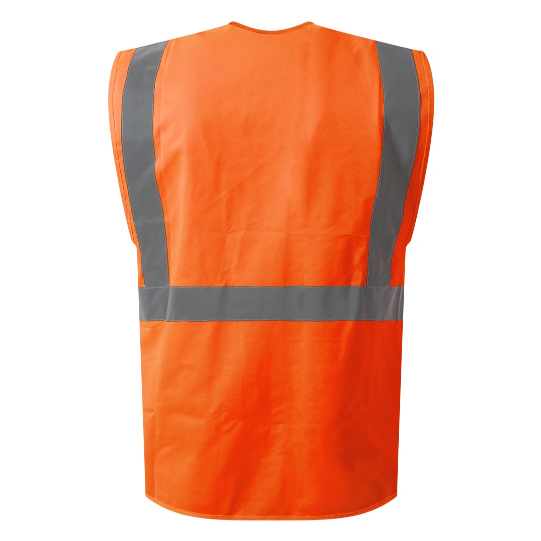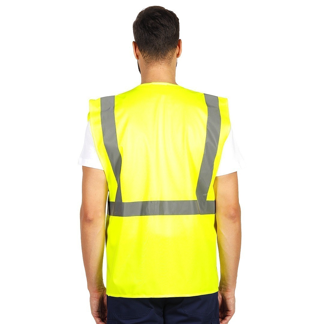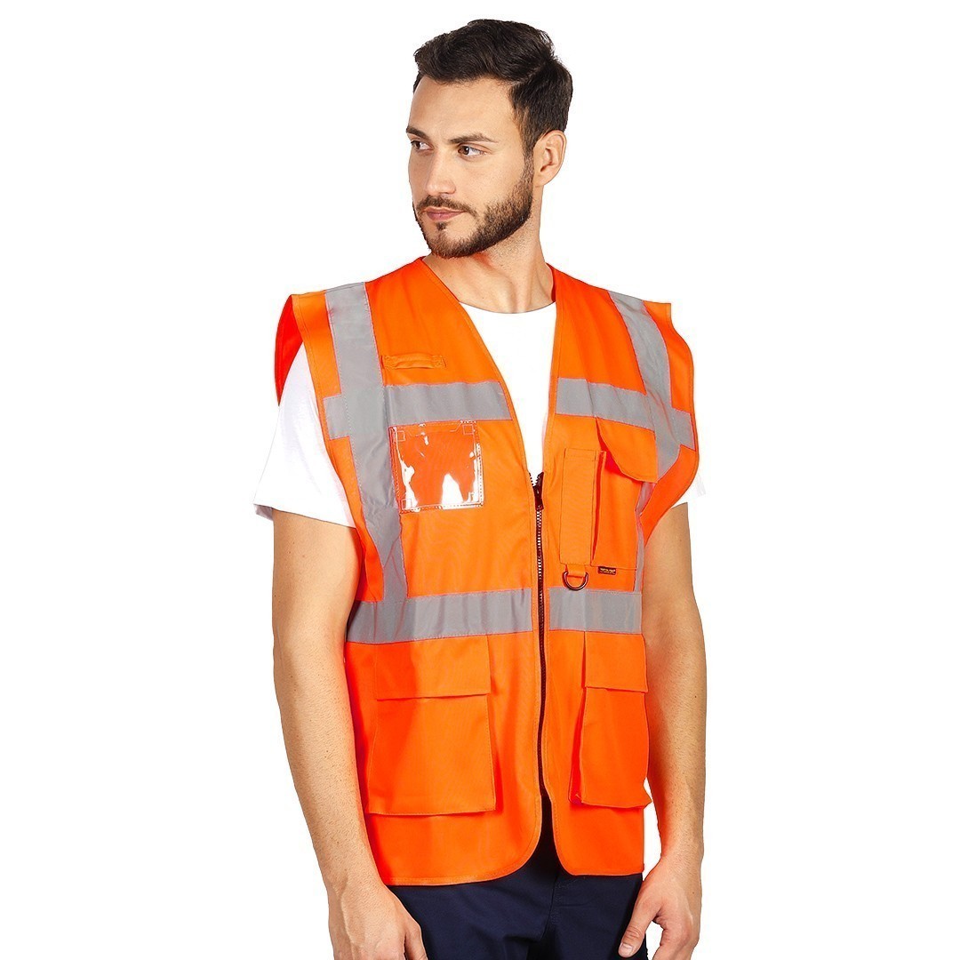 Prsluk, fluorescentni, dve reflektivne trake napred, dve pozadi i jedna preko ramena, četiri prednja džepa, džep za mobilni telefon i olovku, plastični uložak za ID karticu, plastična gajka za ključeve i gajka za slušalice