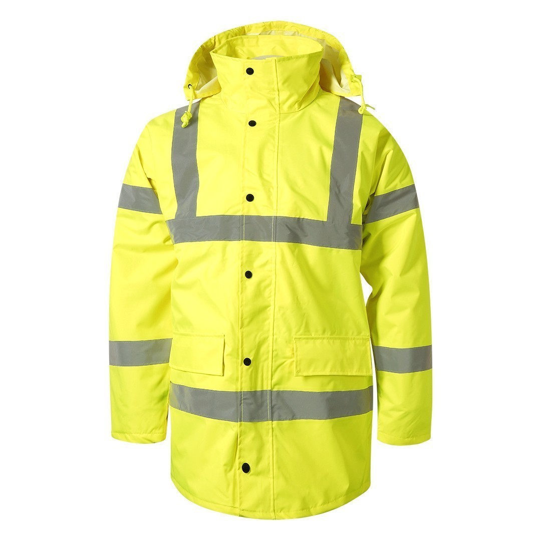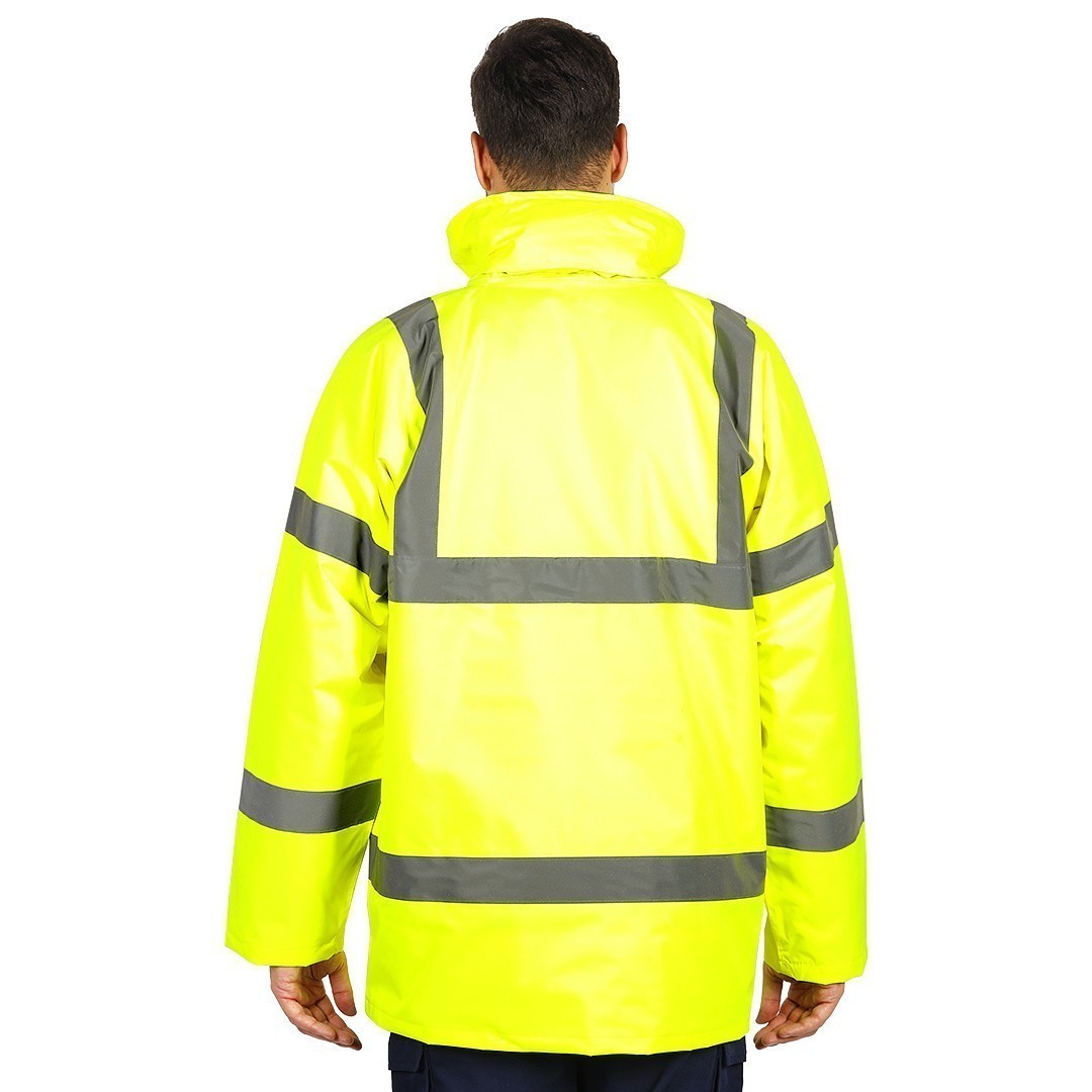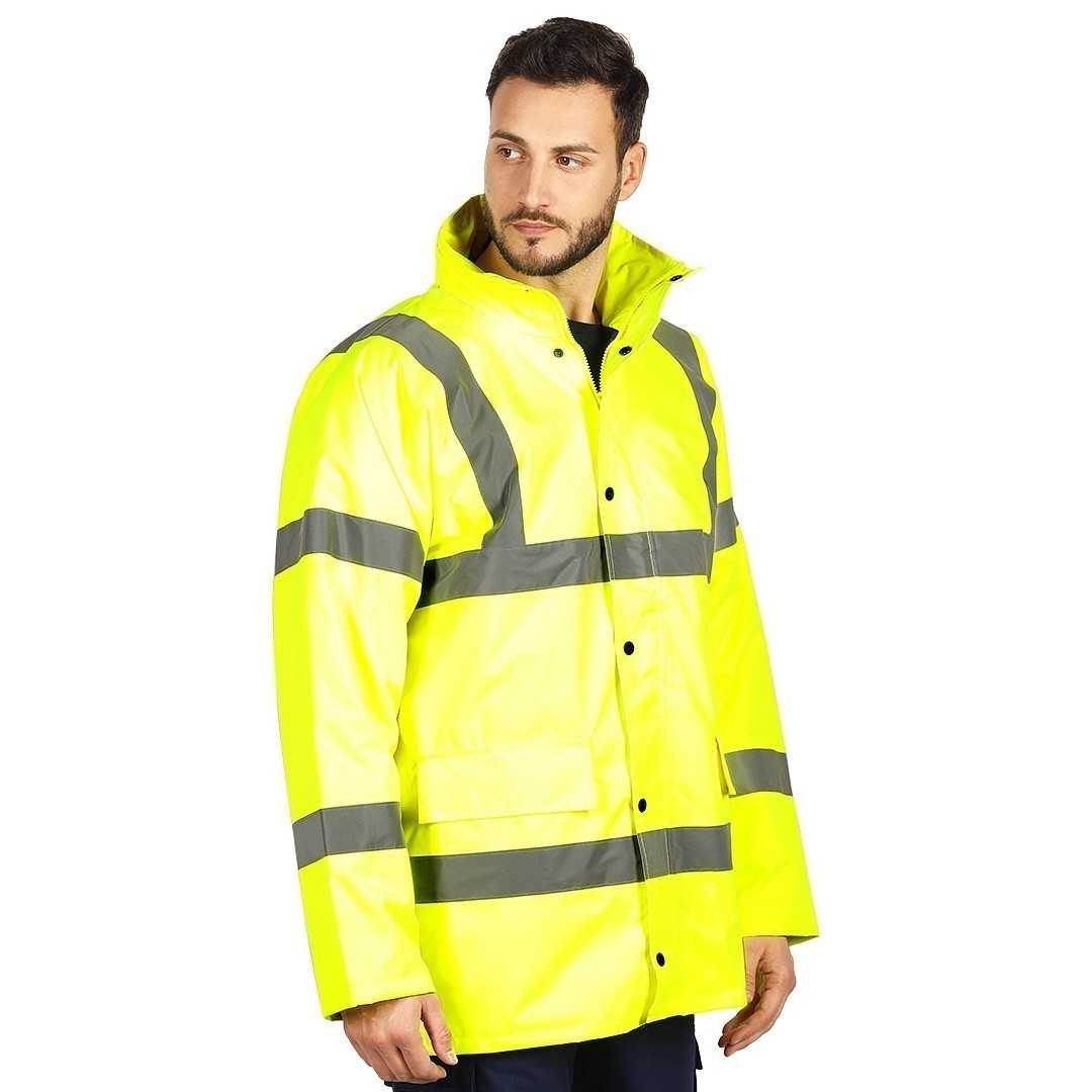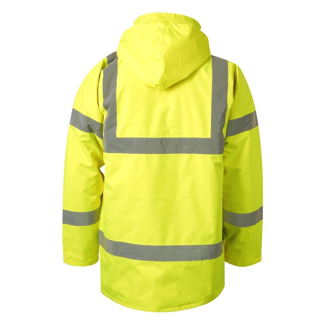 Jakna, fluorescentna, visoka kragna, dve reflektivne trake napred, dve pozadi, dve na rukavima i jedna preko ramena, dvosmerni rajsferšlus i preklop sa drikerima, skidajuća kapuljača sa regulatorima, savijena u kragni koja je zatvorena čičak trakom, ranfle u rukavima za dodatnu zaštitu od hladnoće, vodootporni štepovi, dva prednja džepa, dva unutrašnja džepa, skriveni unutrašnji rajsferšlus na leđima za lakši pristup prilikom štampanja