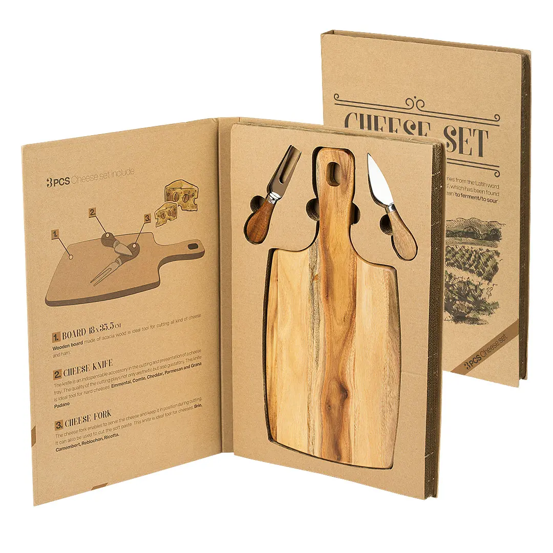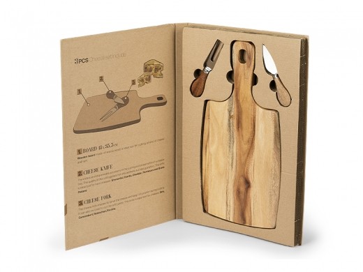 Materijal: drvo (daska), nerđajući čelik (noževi) • Sadržaj seta: drvena daska i 2 noža za tvrde i meke sireve • Namena: sečenje i serviranje sireva i delikatesa • Poklon pakovanje