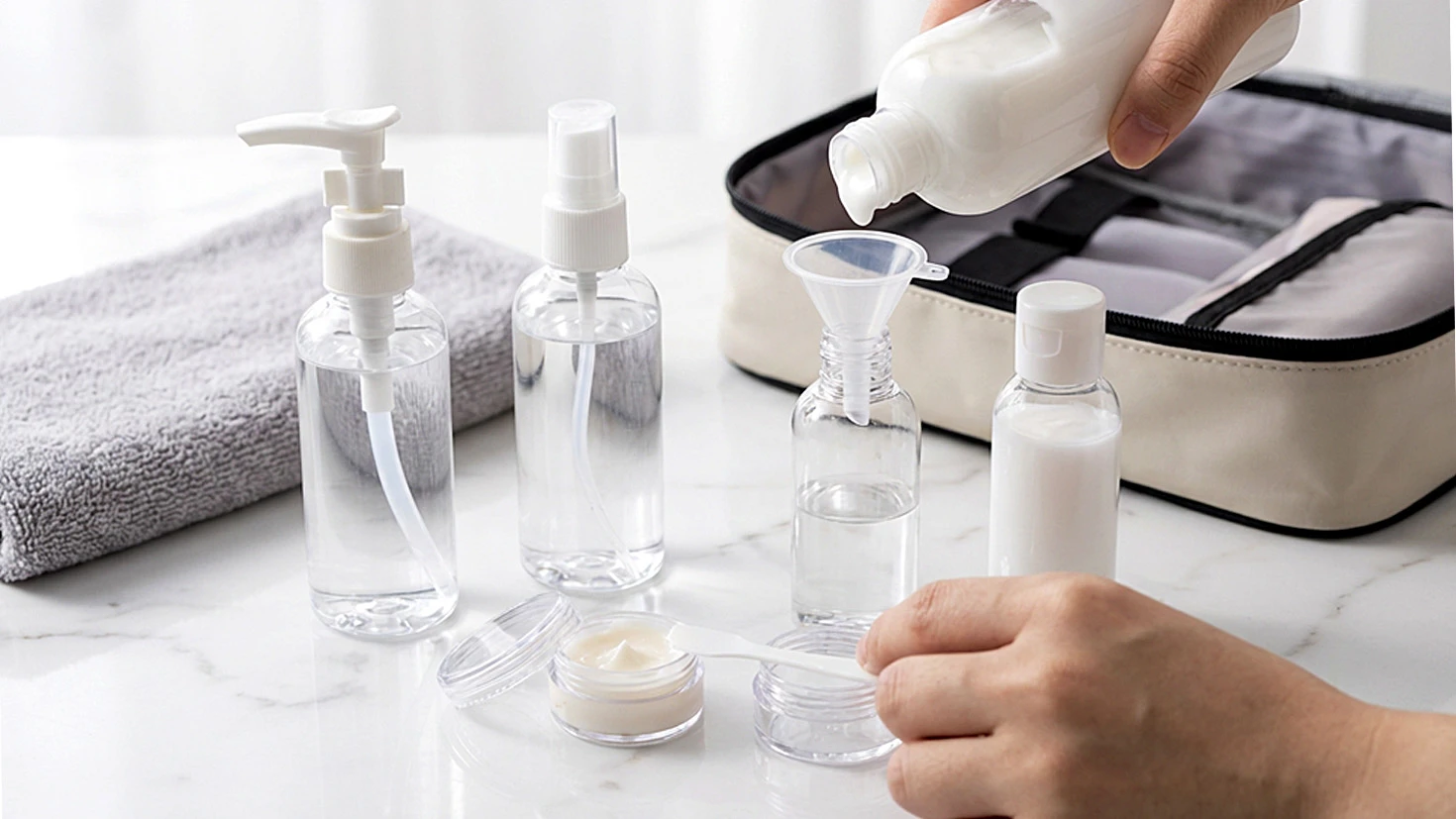 Materijal: plastika • Dozvoljeno za ručni prtljag • Nalepnice za označavanje sadržaja • Sadržaj seta: bočica sa pumpicom (100 ml), bočica sa raspršivačem (100 ml), bočice sa zatvaračem (80 ml i 60 ml), 2 teglice (2 x 10 ml), levak i špatula