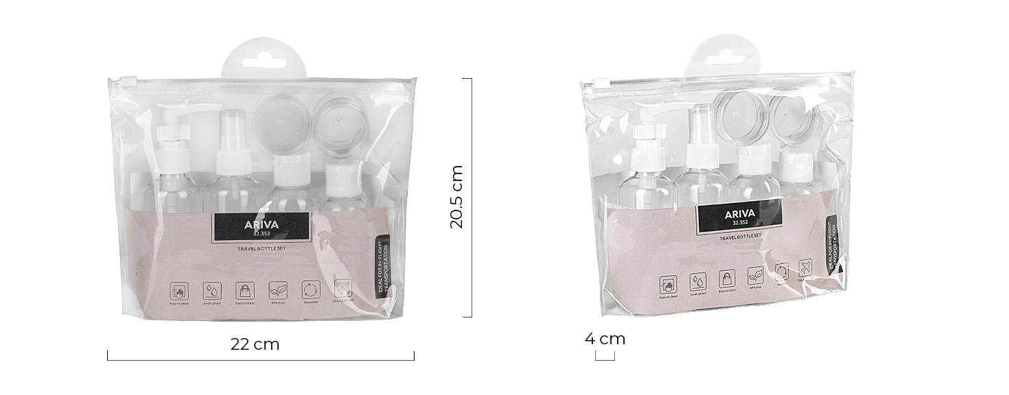 ARIVA je set plastičnih putnih bočica, idealan za sve vrste putovanja. Sve bočice su kapaciteta dozvoljenog za nošenje u ručnom prtljagu, što ovaj set čini savršenim saputnikom za avion, kratka putovanja i vikend-odmore. Set dolazi u putnoj torbici i uključuje nalepnice za označavanje sadržaja (šampon, kupka i drugi proizvodi), što omogućava jednostavnu i preglednu organizaciju kozmetike. Funkcionalan i kompaktan, ARIVA je odličan izbor i kao promotivni proizvod.