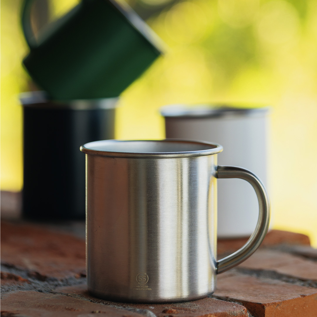 Materijal: reciklirani nerđajući čelik Dimenzija: O 7.8 x 8.7 cm Pakovanje: 48/1 Preporučena štampa: laserska gravura