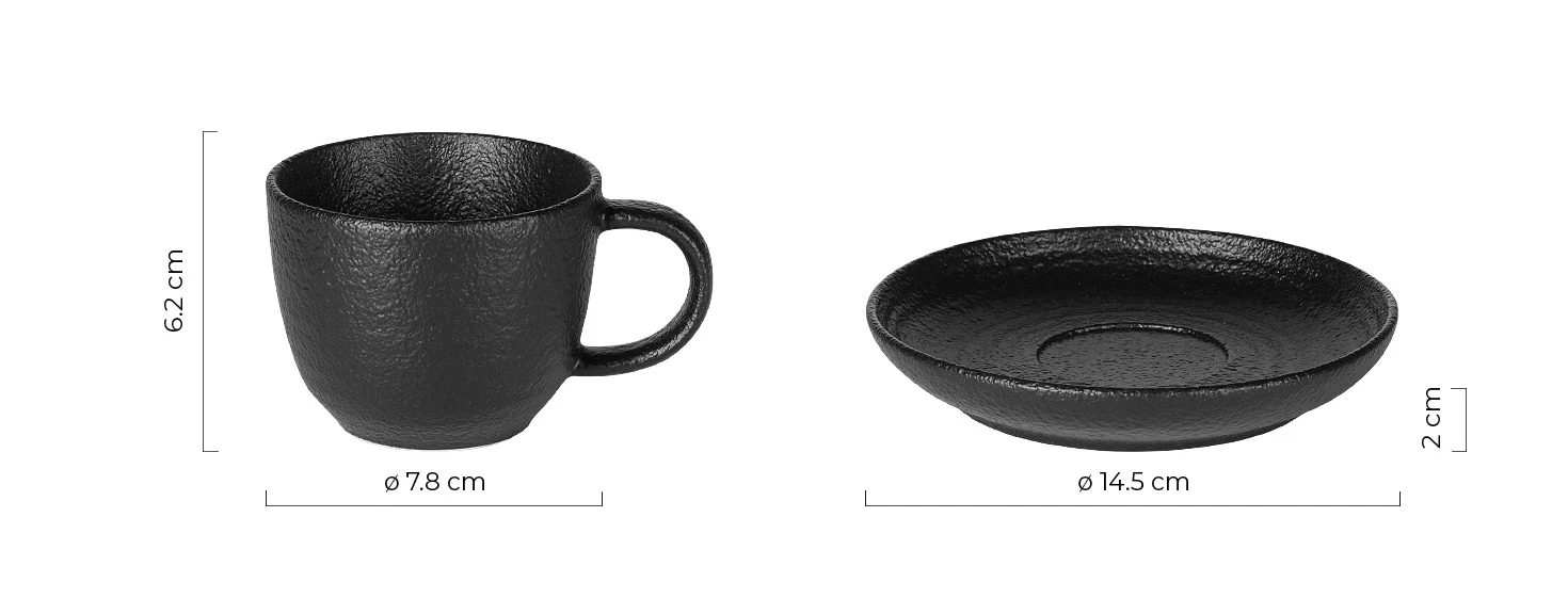 Materijal: keramika • Set: 2 šoljice + 2 tacne • Kapacitet: 2 × 180 ml • Glazura spolja i iznutra (efekat teksture) • Pogodno za pranje u mašini za sudove • Pogodno za upotrebu u mikrotalasnoj pećnici • Premium poklon pakovanje