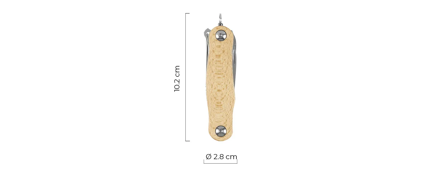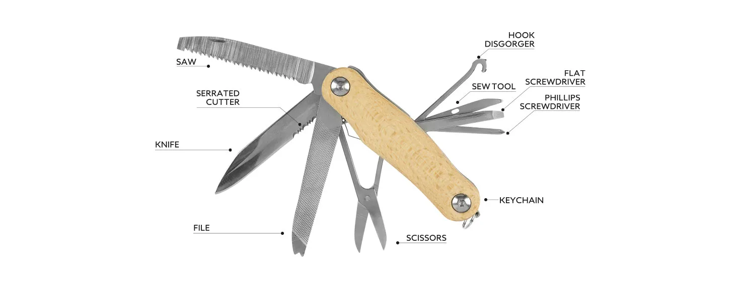 10 funkcija: nož, makazice, turpija, testera, nazubljeni sekač, privezak za ključeve, alat za šivenje, kuka za vađenje udice, krstasti odvijač, ravni odvijač