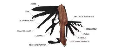 12 funkcija: klešta, nož, turpija, krstasti odvijač, 2x ravni odvijač, sekač žice, bušač za kožu, otvarač za konzerve, otvarač za flaše, 2x testerica