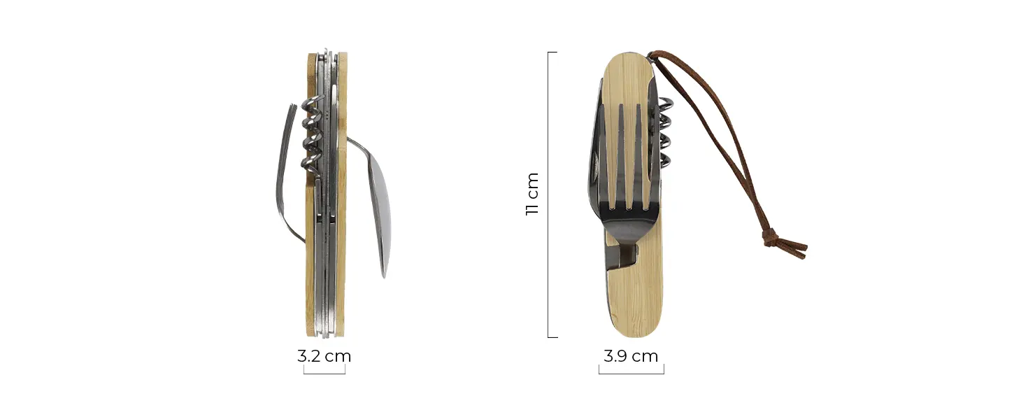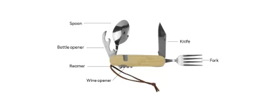 6 funkcija: kašika, otvarač za flaše, razvijač, otvarač za flaše za vino, viljuška, nož