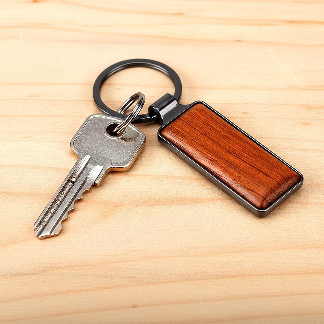Privezak za ključeve • Legura cinka i drvo • Drvena pločica • Završna obrada tamni metal • Velika površina za štampu • Elegantni dizajn • Pakovan u poklon koverti