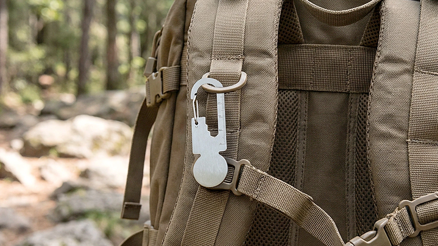 Materijal: nerđajući čelik • Funkcije: otvarač za flaše, lenjir, žeton za kolica za kupovinu, karabinjer, ključ za šrafove, privezak • Papirno pakovanje