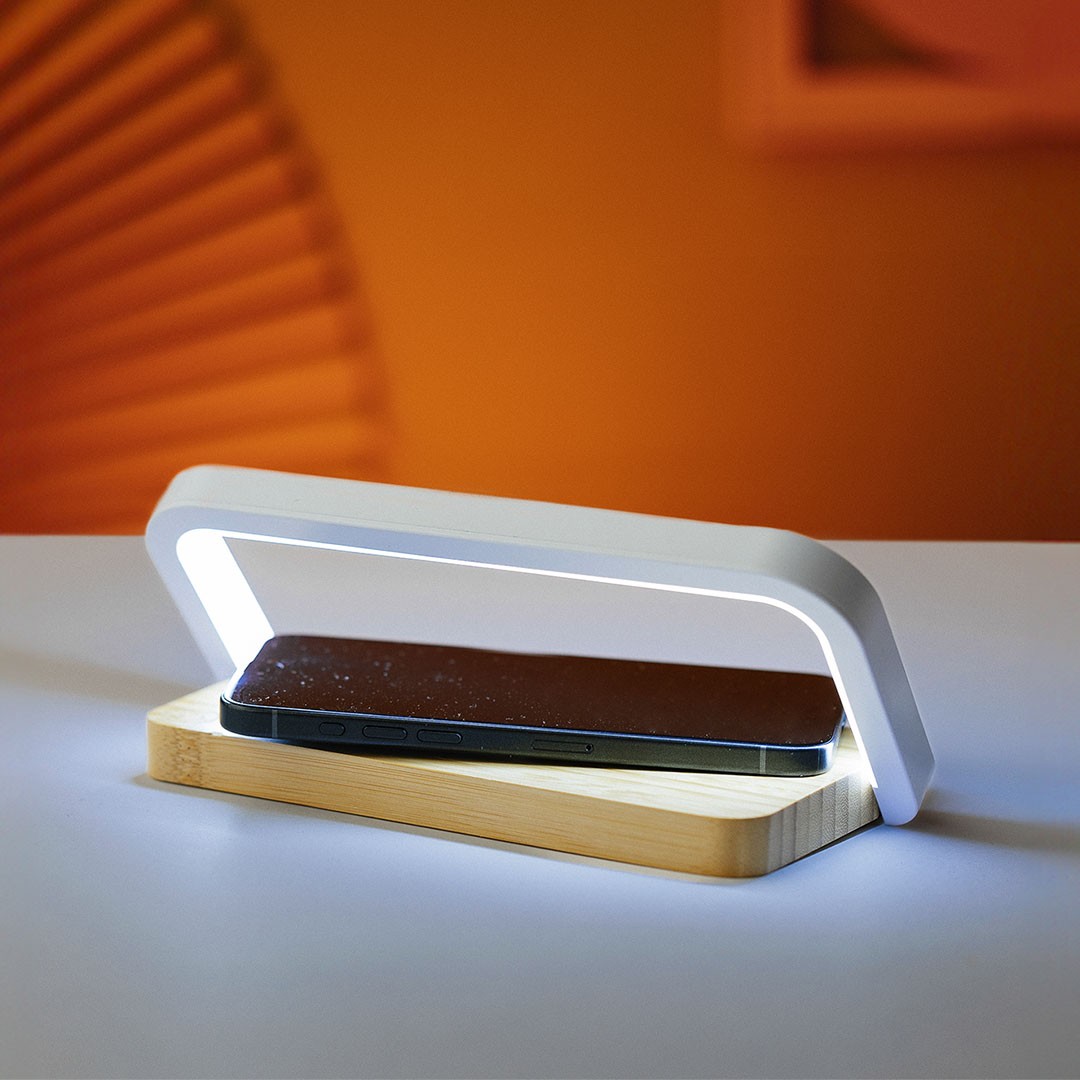 Bežični punjač sa držačem za telefon i integrisanom lampom, namenjen praktičnoj upotrebi na radnom stolu ili noćnom stočiću. Omogućava bežično punjenje mobilnih uređaja snage do 15W i kompatibilan je sa svim uređajima koji podržavaju Qi tehnologiju.