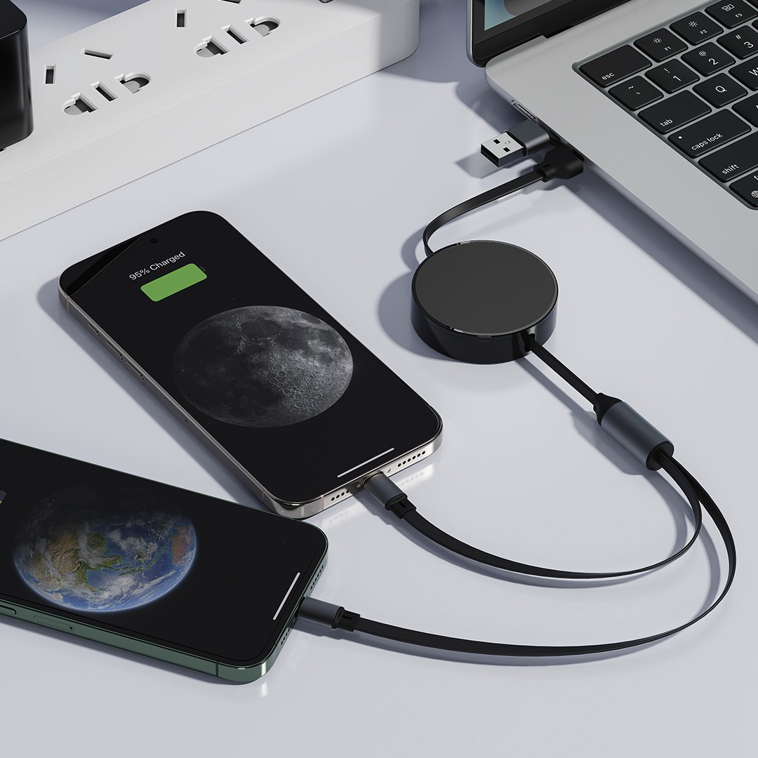 Materijal: aluminijum, plastika • Dužina kabla: 1 m • Ulaz: USB-A/Type-C • Izlazi: 2 × Type-C • Snaga punjenja: do 2 × 100 W • IC funkcija (pametan čip za regulaciju snage) • PD (Power Delivery) funkcija • Funkcije: punjenje i prenos podataka • Kompatibilno sa uređajima: pomoćne baterije, mobilni telefoni, tableti, laptopovi, računari • Poklon pakovanje