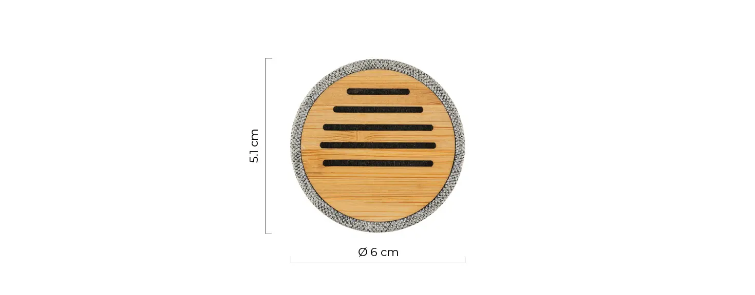 Material: bambus Dimenzija: O 6 x 5.1 cm Pakovanje: 64/1 Preporučena štampa: laserska gravura, digitalna štampa, tampon