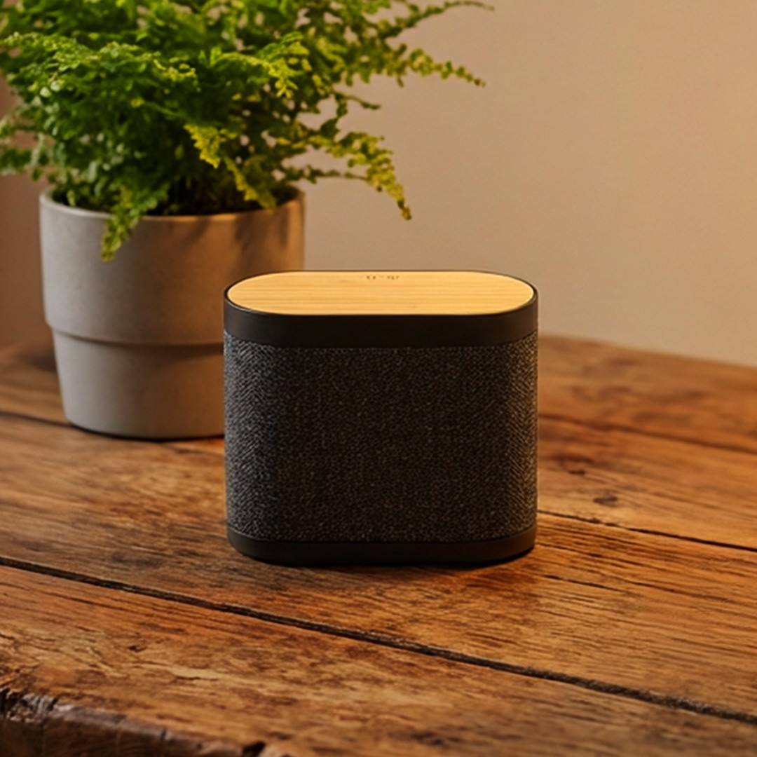 Bežični zvučnik sa integrisanim bežičnim punjačem, dizajniran kao funkcionalan i atraktivan promotivni proizvod za kancelarije, radne stolove i poslovne prostore. Kombinuje bežično punjenje snage do 15 W i bežični zvučnik od 5 W, omogućavajući istovremeno punjenje telefona i reprodukciju zvuka. Kućište od bambusa i RPET materijala daje prirodan i savremen izgled, dok kompaktan format čini proizvod idealnim za svakodnevnu upotrebu i dugotrajnu vidljivost brenda. Isporučuje se u poklon kutiji sa uključenim Type-C kablom za punjenje.