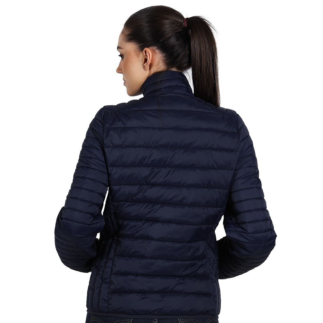 Ženska jakna sa laganim punjenjem, štepana, dva prednja džepa sa rajsferšlusom, elastičnim paspulima na rukavima i dnu, vrećica za pakovanje