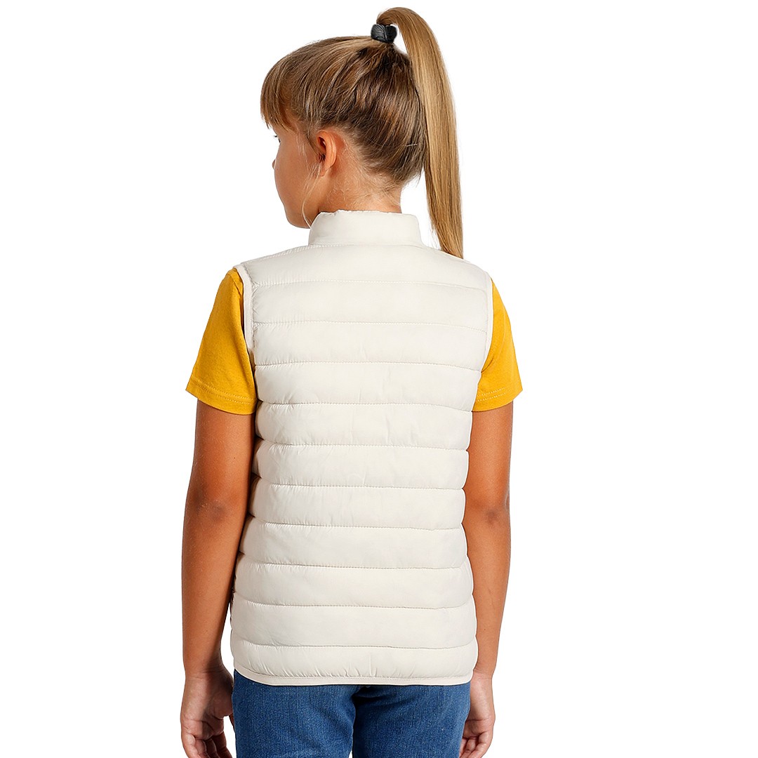 Dečji prsluk sa laganim punjenjem, štepani, dva prednja džepa, elastični paspuli oko ramena i džepova, vrećica za pakovanje.
