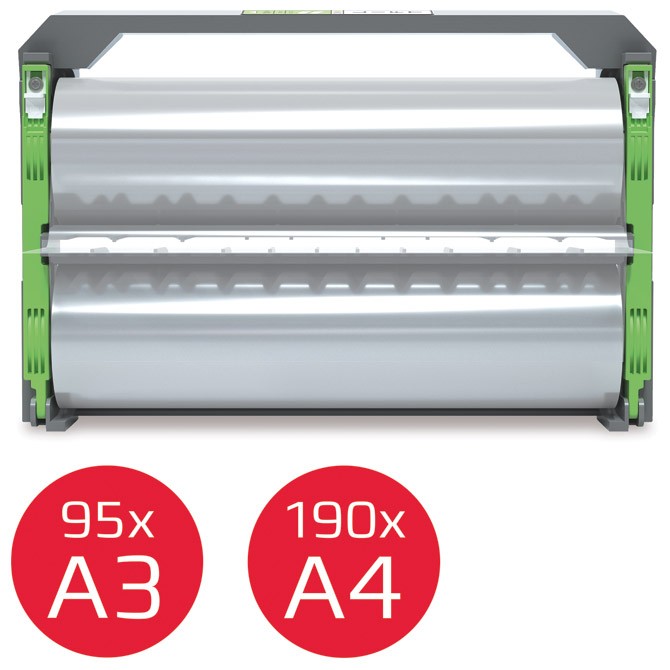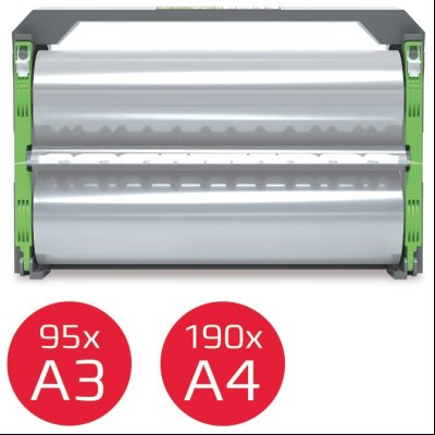 sjajna; u rolni na plastičnoj konstrukciji; debljina 100 mikrona; dužina 42,4m: plastificira format A3 95 kom, A4 190 kom