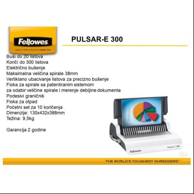 za format A4; buši do 20 listova 80 gramskog papira; maksimalna veličina spirale do 38 mm; kapacitet: 300 listova; električna; povezuje samo u plastičnu spiralu; sadrži: početni komplet za 10 koričenja, fioku za odlaganje spirala, podesivi graničnik za precizno poravnanje listova, fioku za otpad, dugme za bušenje, selektor promera spirala prema debljini dokumenta; metalni mehanizam za duži vek trajanja; dimenzija: 432x388x130 mm; težina: 9,5 kg; garancija na mašinu 2 godine