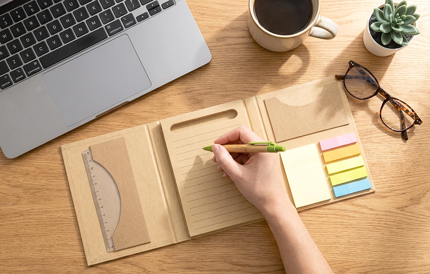 Kancelarijski set od kartona koji sadrži blok za pisanje, samolepljive stikere, lenjir, hemijsku olovku od kraft papira i držač za vizit karte.