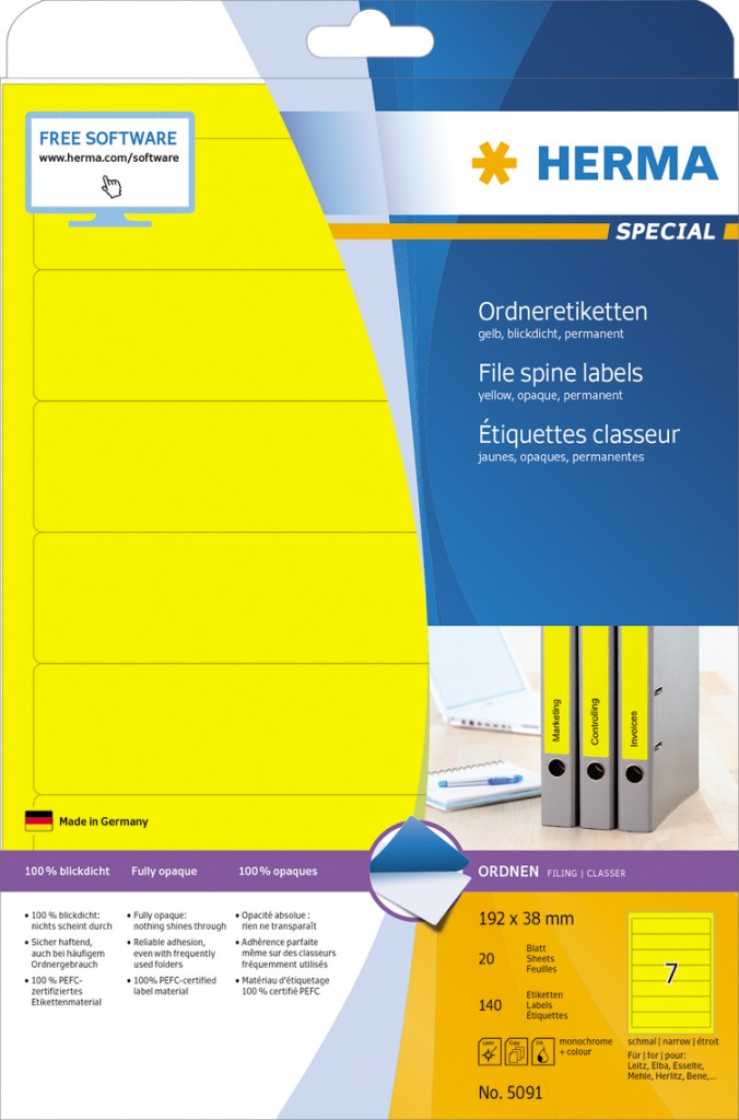 Kod etiketa za registratore HERMA ispunjava svaku želju potrošača sa različitim karaktreristikama prijanjanja u svim formatima koji su u upotrebi, u puno boja. Potpuno neprovidne. Sigurno prijanjaju i kod intenzivnog korišćenja registratora. Idealne za oznaku firme, opise i napomene.
