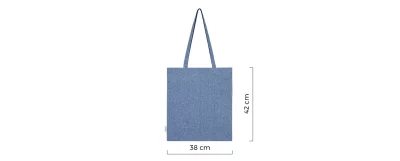 Materijal: reciklirani pamuk i reciklirani poliester Dimenzija: 38 x 42 cm Ručke: 70 x 2.5 cm Pakovanje: 200/50 Preporučena štampa: sito, preslikač