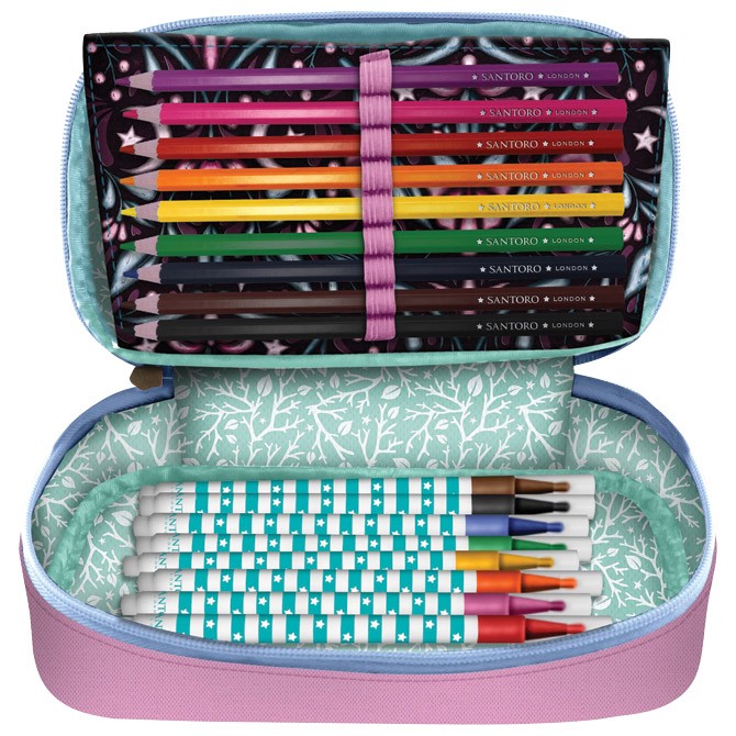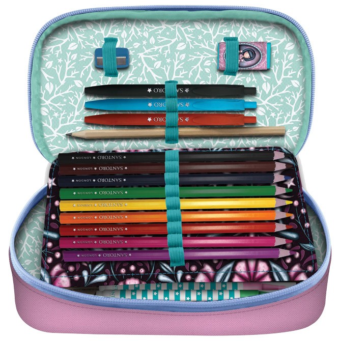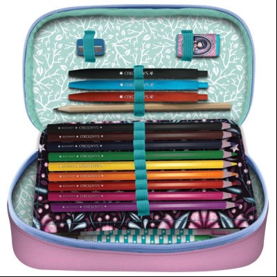 ovalna, 1 zip 1 preklop; punjena sa 45 komada pribora: flomaster školski 18 boja, boje drvene 18 boja, olovka grafitna HB, rezač, gumica, lenjir 15 cm, trougao; uglomer 180° pvc i olovka hemijska x 3 komada (crna, crvena i plava); dimenzija: 22,5x12,5x6,5 cm