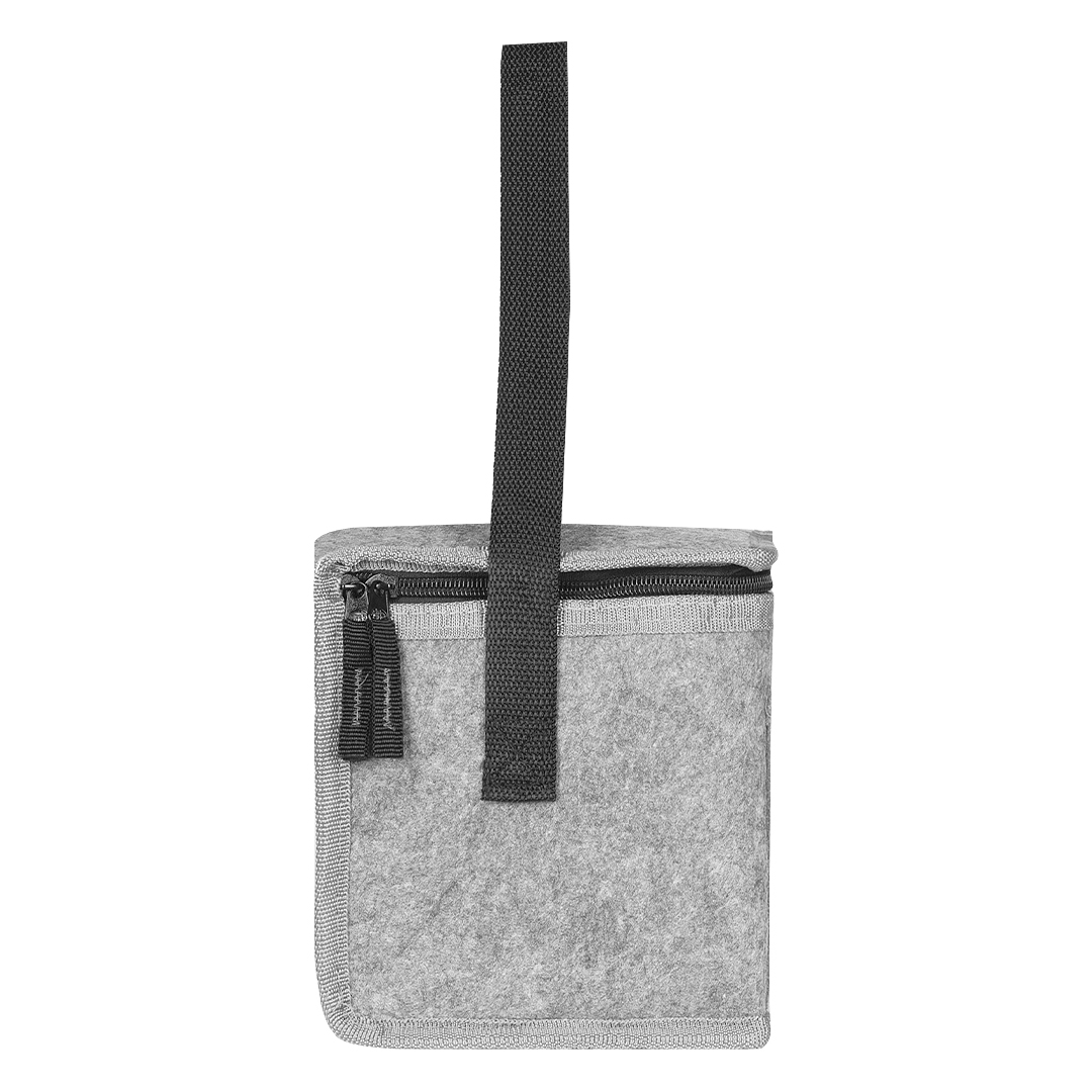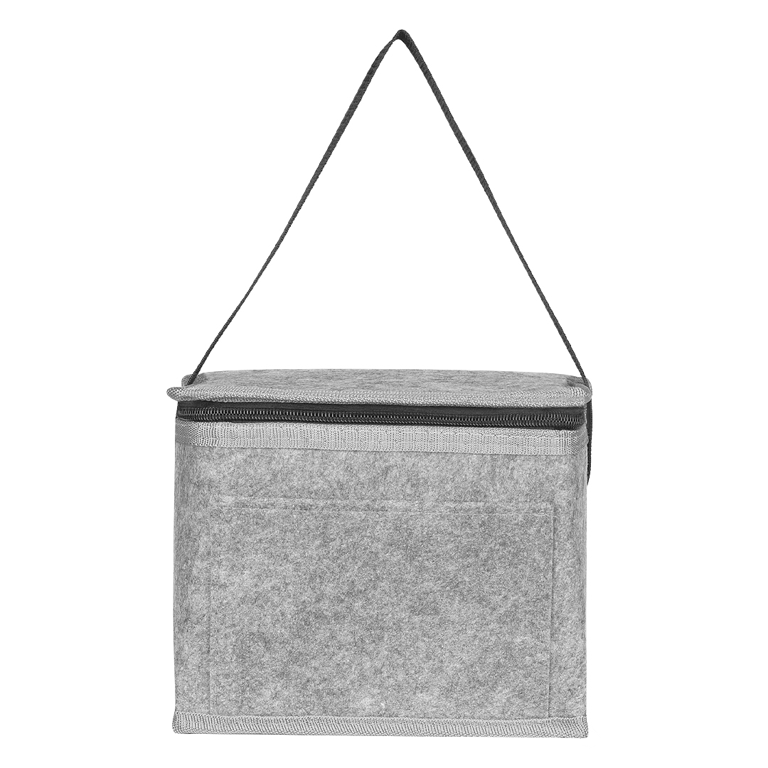 Spoljašnji sloj je izrađen od filca (felt), koji daje savremen i kvalitetniji vizuelni utisak, dok unutrašnja izolacija od pene sa PEVA postavom omogućava bolje održavanje temperature. Glavni termo odeljak zatvara se rajsferšlusom, a prednji džep od istog materijala pogodan je za lakšu štampu i personalizaciju. Ručke od poliesterske trake sa X-cross ojačanjem doprinose izdržljivosti, dok kontrastni detalji i paspul dodatno naglašavaju moderan dizajn. Kapacitet je oko 6 limenki (0,5 l), uz mogućnost korišćenja rashladnih uložaka.