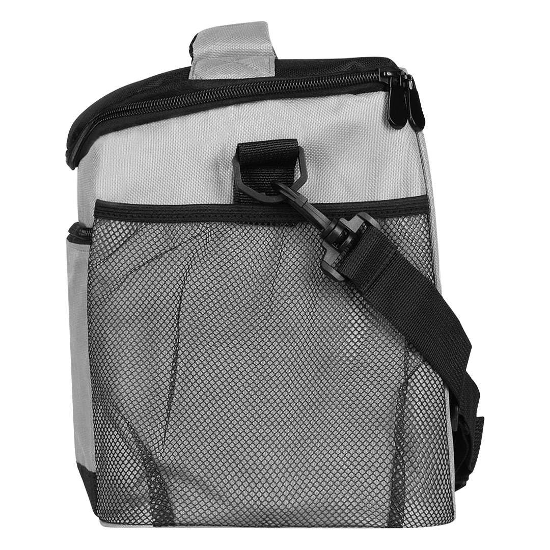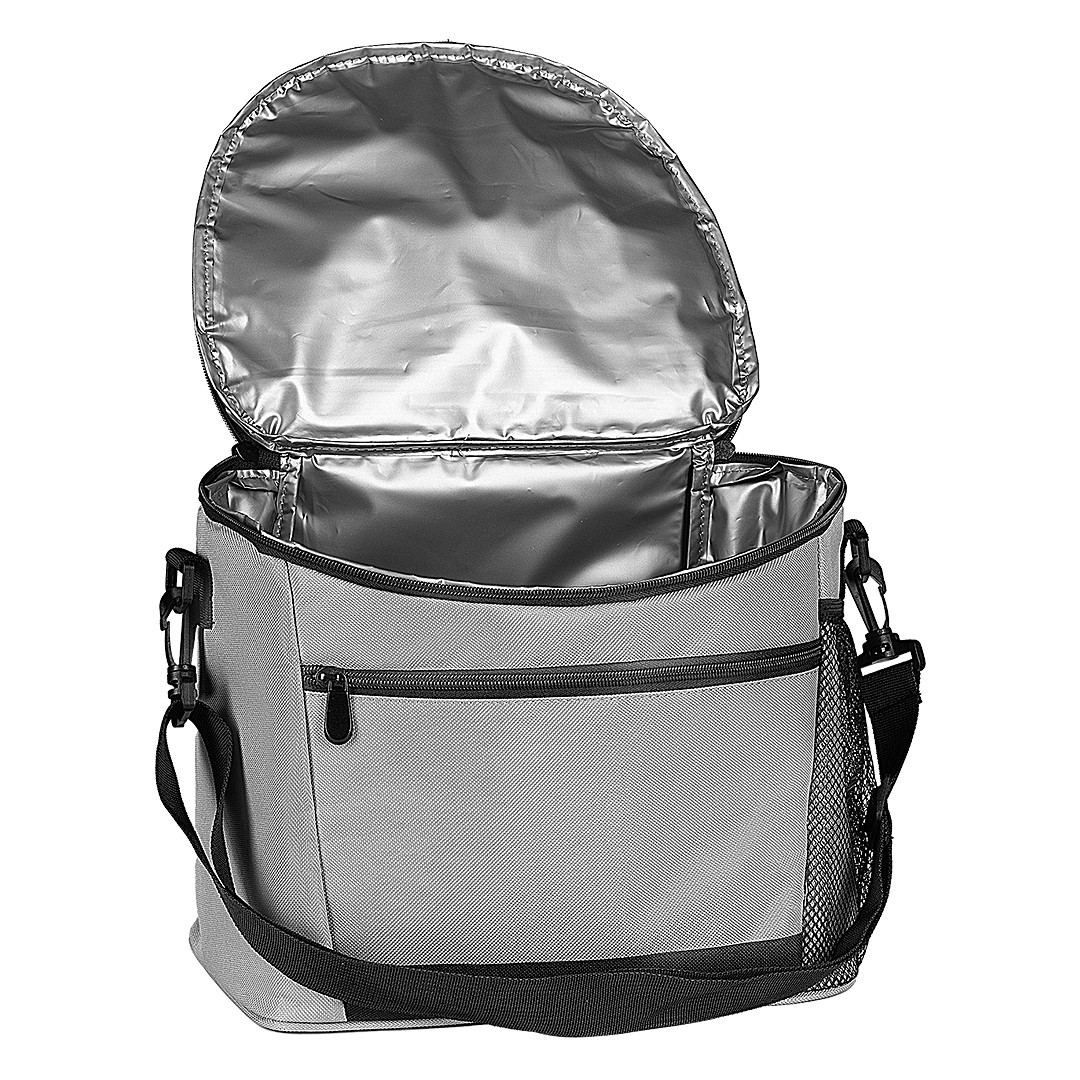 Spoljašnji materijal je izdržljivi 600D poliester, dok unutrašnja struktura kombinuje EPE penu i PEVA aluminijumsku oblogu za efikasnije očuvanje temperature. Glavni odeljak zatvara se gornjim rajsferšlusom, a dodatni prednji zip džep i bočni mrežasti džep omogućavaju nošenje sitnica i dodatne opreme. Podesivi rameni kaiš olakšava nošenje, a kapacitet od oko 6 limenki (0,5 l) čini ovaj model praktičnim za širu upotrebu.