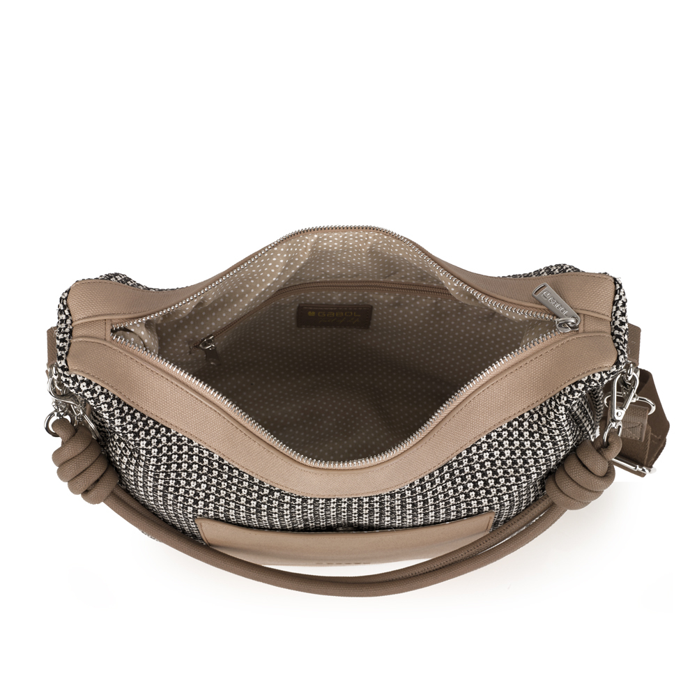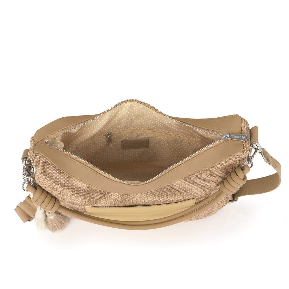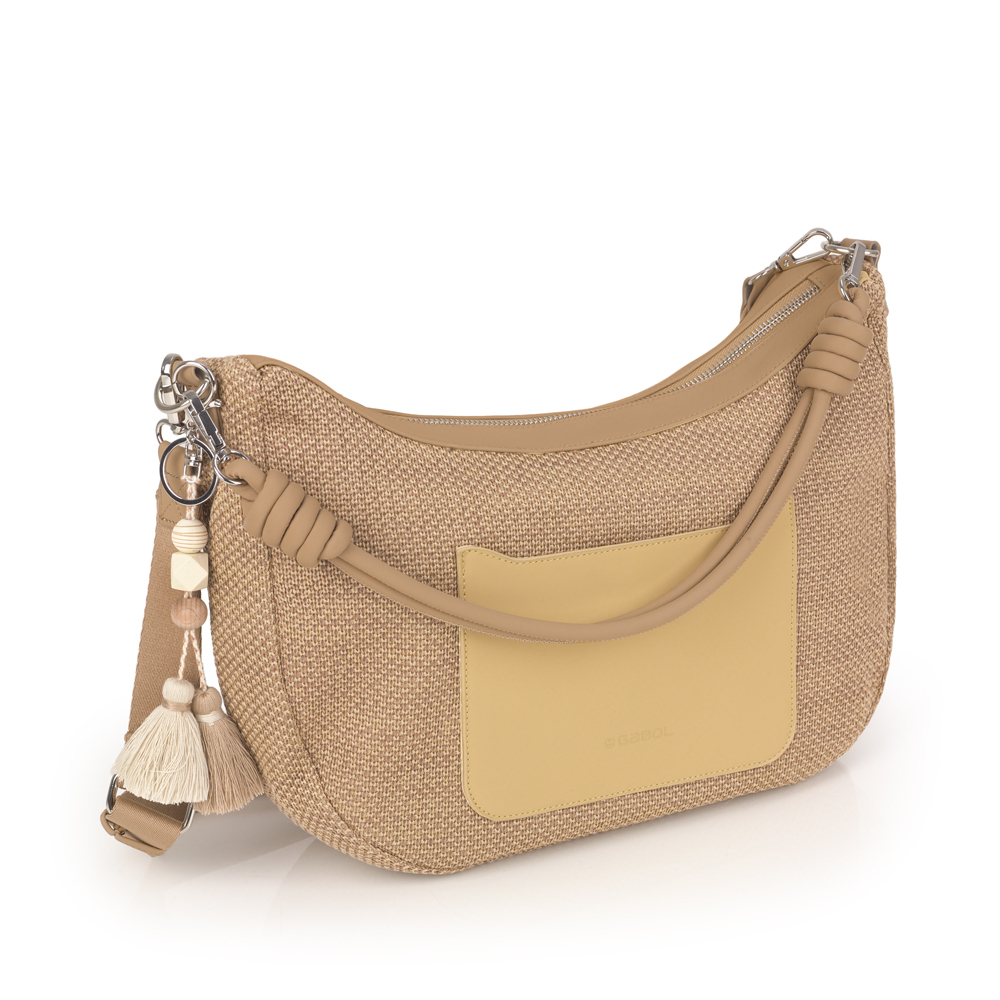Prostrana i moderna, Gabol ženska torba predstavlja idealan aksesoar za letnju sezonu, spajajući opuštenu primorsku estetiku sa vrhunskom urbanom funkcionalnošću. Izrađena je od visokokvalitetne teksture rafije (polietilena) koja verno dočarava izgled prirodnog pletenog materijala, ali uz znatno veću čvrstinu i otpornost na habanje. Prepoznatljiv polukružni oblik torbe elegantno je naglašen detaljima od premijum sintetičke kože (poliuretana) u bež nijansi, uključujući i veliki prednji džep koji omogućava brz pristup najvažnijim stvarima. Ovaj model nudi maksimalnu fleksibilnost pri nošenju zahvaljujući širokom, podesivom tekstilnom remenu, kao i kraćoj dekorativnoj ručki sa specifičnim čvorovima za nošenje u ruci. Autentičan vizuelni identitet dodatno je istaknut unikatnim priveskom sa drvenim perlama i pamučnim kićankama, dok prostrana unutrašnjost sa dezeniranom postavom i sigurnosnim džepom osigurava besprekornu organizaciju. Zahvaljujući upotrebi savremenih polimera, torba je izuzetno laka za održavanje, zadržava svoj oblik i boju, te predstavlja superioran izbor za korisnice koje traže balans između velikog kapaciteta i besprekornog letnjeg stila.