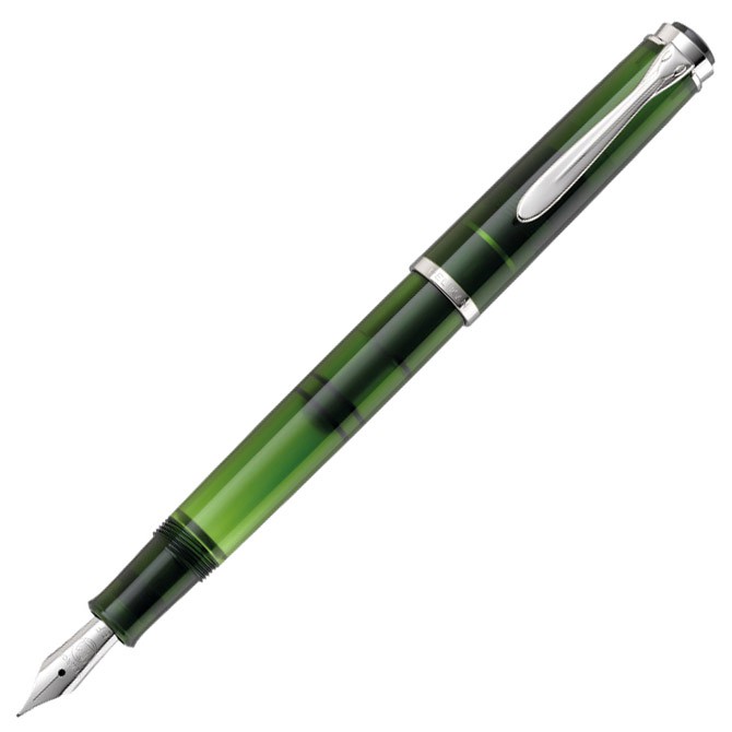 klasična serija 205 sa poliranim perom od nerđajućeg čelika; hromirana klipsa; debljina pera M (medium); s klipnim mehanizmom; tinta 50ml Edelstein maslinasto zelena; u poklon kutiji