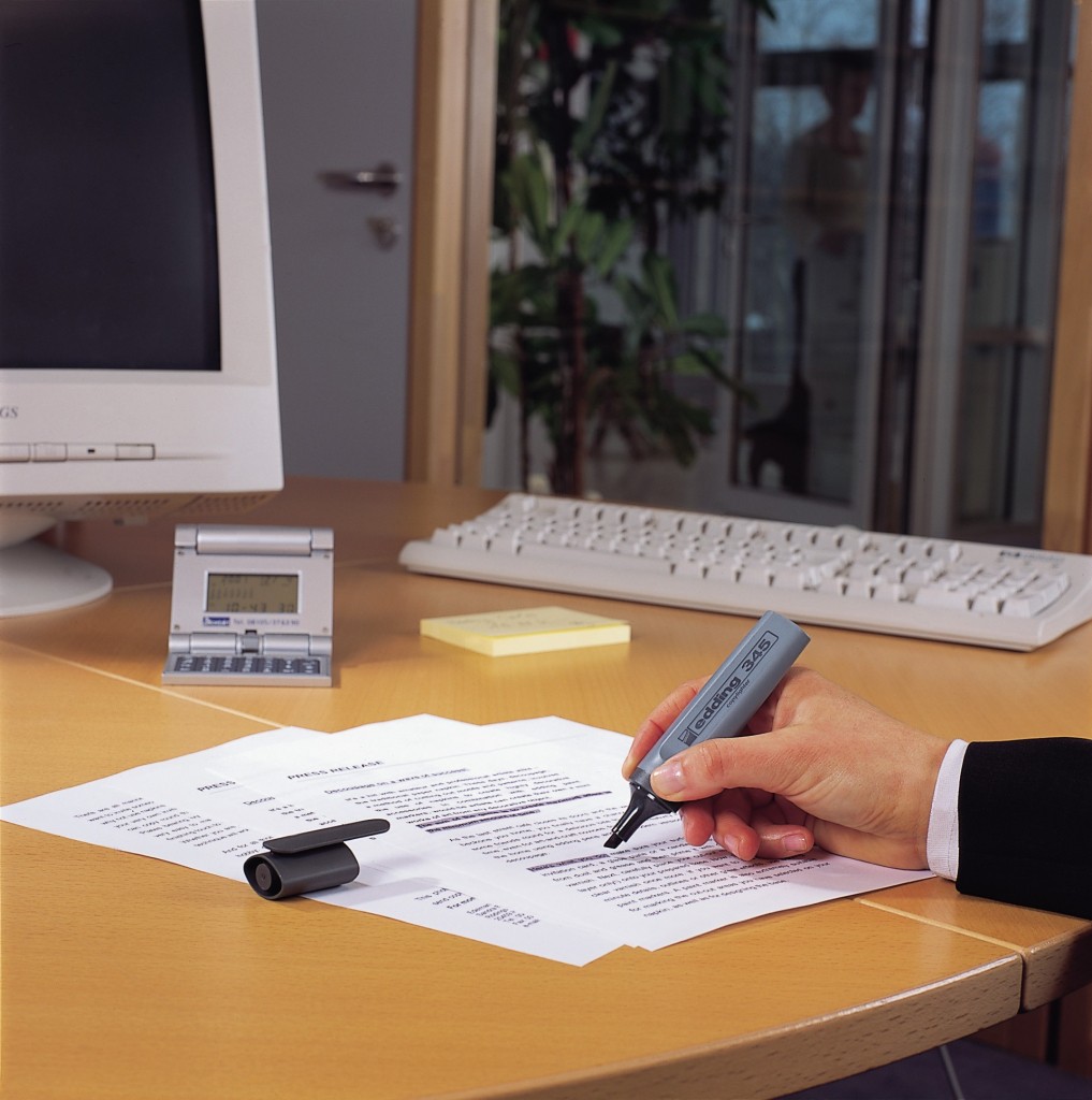 Marker za jasne oznake i isticanje tekstova i beleški na skoro svim papirnim površinama. Vrh ima širinu linije od 2 do 5 mm. Briljantno neonsko mastilo je na bazi vode i ima visok nivo sjaja boje. Može se koristiti na materijalima odštampanim na ink jet štampačima, a siva boja se vidi prilikom kopiranja. Poklopac ima klipsu - idealno za pričvršćivanje na držač olovke ili sveske.