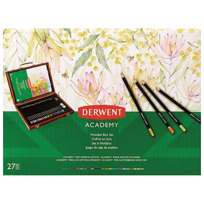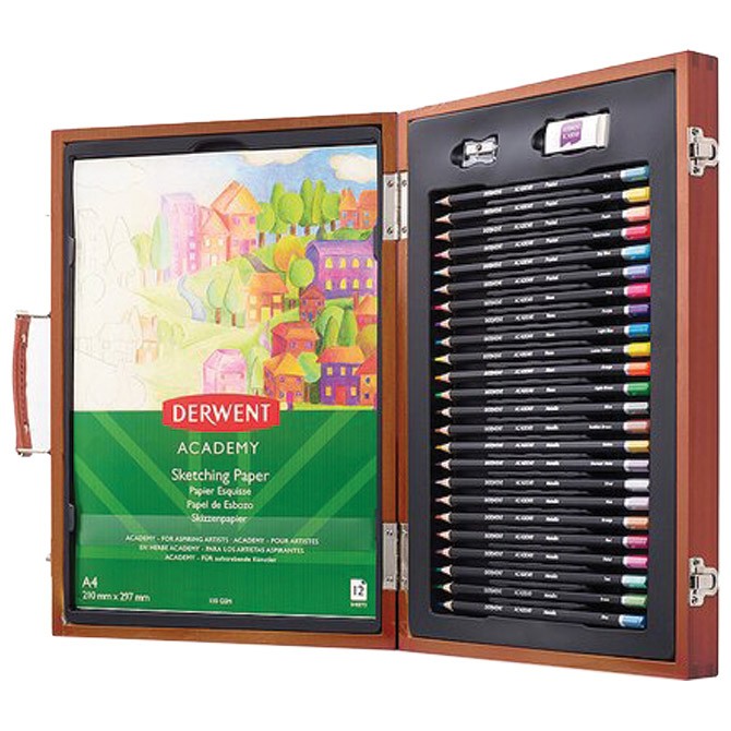 Set u drvenoj kutiji Boje drvene 24boje+gumica+rezač+blok Academy Derwent 2305950!!