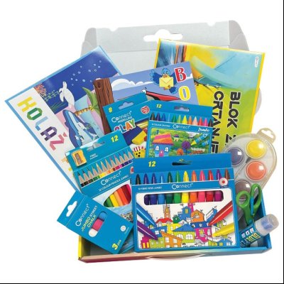 set sadrži: flomastere Jumbo 12boja, boje drvene Jumbo 12boja sa rezačem, boje voštane Jumbo 12boja, boje vodene fi 40mm 10boja sa četkicom, plastelin 8boja 152g, krede Jumbo 3boje; lepak tečni 50ml, makaze 13cm, kolaž papir A410 listova ; blok za crtanje B-2 10 listova; bojanke; u kartonskoj kutiji sa ručkom