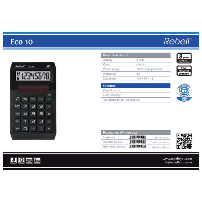 8 mesta; 1-linijski display; plastične tipke; izvor napajanja: solarni 100%; dimenzija: 70x118x13mm; težina: 50g; napravljen od recikliranog materijala; sadrži sertifikat: "Dear Blaue Engel"; garancija 3 godine