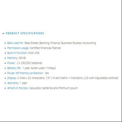 12 mesta; 170 funkcija (statističke, finansijske i matematičke); automatsko isključivanje nakon 5 minuta; zaštita memorije od isključivanja (memorijski registri 22); 1-linijski display; plastične tipke; metalni okvir displeja; izvor napajanja: baterija CR2032x2kom; trajanje baterije 1 godina (kod korišćenja 1h dnevno); dimenzija:145x81x15mm; težina:85g; pakovanje: blister; u pakovanju: kalkulator, baterije i zaštitni omot
