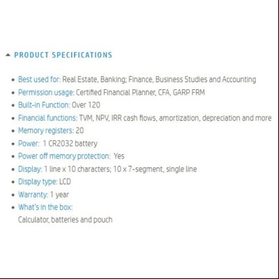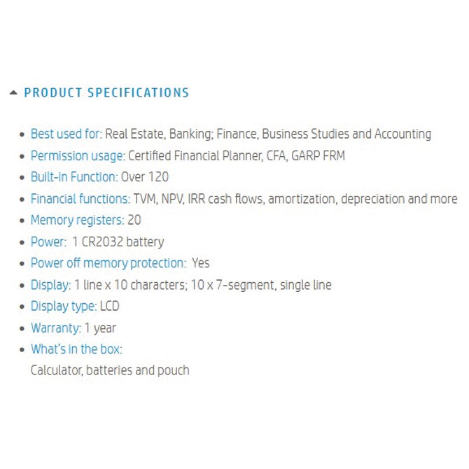 10 mesta; 120 funkcija (finansijske funkcije:TVM, NPV, IRR…); zaštita memorije od isključivanja (memorijski registri 20); 1-linijski display; plastične tipke; materijal kućišta: plastika i brušeni aluminijum; izvor napajanja: baterija CR2032x1kom; trajanje baterije 1 godina (kod korišćenja 1h dnevno); dimenzija:127x78x13mm; težina:180g; pakovanje: blister; u pakovanju: kalkulator, baterija i zaštitni omot