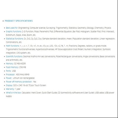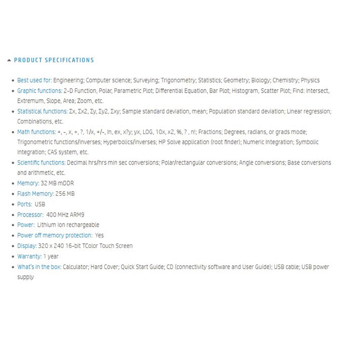 Ekran u boji 3,5inča; osetljiv na dodir (multi-touch technology); grafički 2D/3D prikaz; plastične tipke; materijal kućišta: plastika i brušeni aluminijum; aplikacije sa numeričkim, grafičkim I simboličkim prikazima čine ga jednostavnim za korišćenje; pogodan je za inženjering, informatiku, trigonometriju, statistiku, geometriju, biologiju, hemiju…; Memory Standard 32 MB DDR/Flash memory 256 MB; USB priključak; procesor 400 MHz ARM9; dimenzija:182x86x14mm; težina: 228g; kućište brušeni metal I plastika; zaštitni klizni poklopac; pakovanje: kalkulator, cd, USB punjač