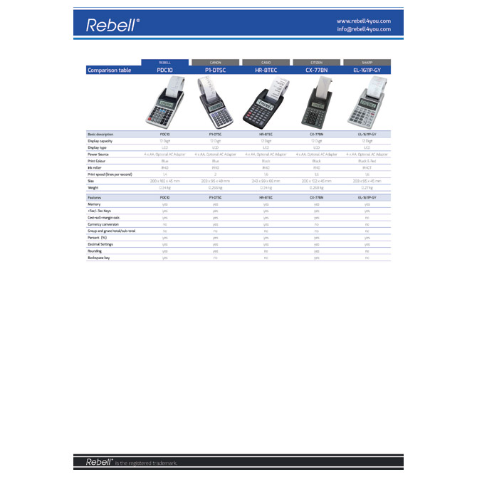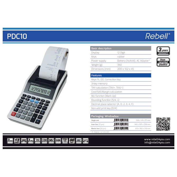 12 mesta; gumene tipke; brzina ispisa: 1,4 reda/sekundi; dvostruki izvor napajanja: baterije AAAx4kom (u pakovanju) i na struju sa AC adapterom RE-AD PDC EU (nema u pakovanju); ading rolna: 57mm; štampanje u plavoj boji, valjak tintni IR40; dimenzija: 102x200x45mm; težina: 340g; napravljeno od reciklirane plastike; pakovanje: prozor-kutija; garancija 3 godine