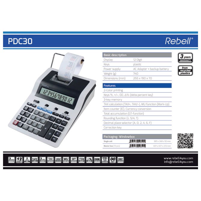 Računska mašina 12mesta sa adapterom Rebell RE-PDC30 WB bela